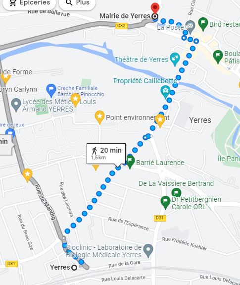 Depuis la gare de Yerres, vous aurez 1.5 km de marche jusqu'à la mairie (20-30 minutes).